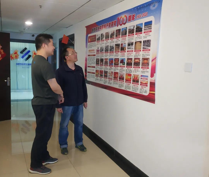 黨史學習教育深入開展以來,化研院在自己的官方微信公眾號上開辟“每周一學一答”活動專欄,使干部職工在公眾號上每次完成相關黨史知識學習后,再完成5道答題,以引領黨員干部職工學黨史、悟思想,積極營造學習黨史的濃厚氛圍。此外,化研院黨總支在華騰科技大廈五層張貼“黨的百年歷史簡圖”,營造學習黨史濃厚氛圍。