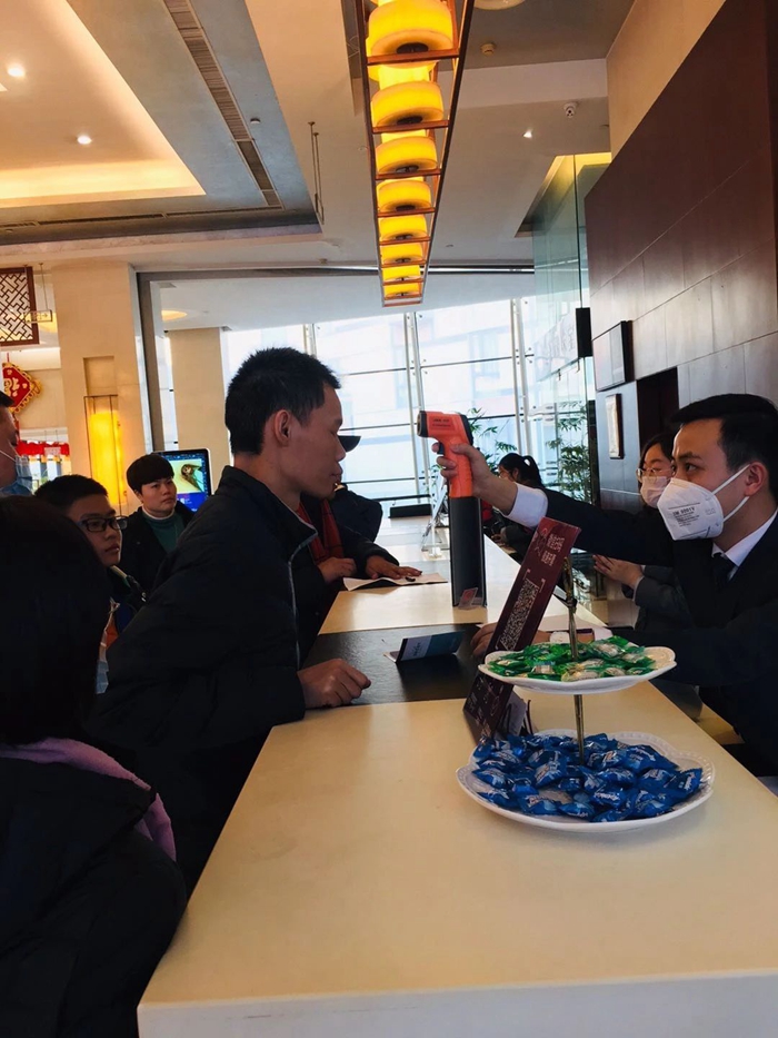 酒店對(duì)公共區(qū)域每一小時(shí)進(jìn)行全面消毒并做好記錄,提高消毒消殺頻次,加大對(duì)客房區(qū)域消毒通風(fēng)力度;同時(shí)在酒店大堂進(jìn)出口設(shè)置賓客體溫檢測點(diǎn)。