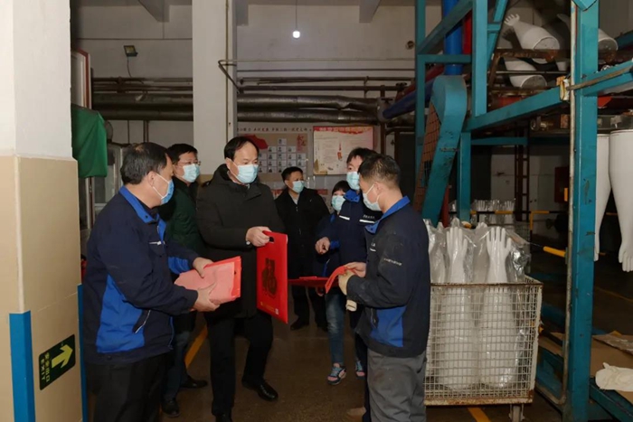 張時(shí)明一行考察了華騰橡塑公司生產(chǎn)現(xiàn)場(chǎng),華騰美居酒店的“暖心驛站”,親切慰問(wèn)堅(jiān)守在一線(xiàn)崗位的職工和困難職工代表,帶去慰問(wèn)品的同時(shí)也送上了親切的問(wèn)候和真情關(guān)懷。